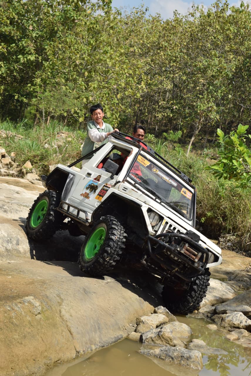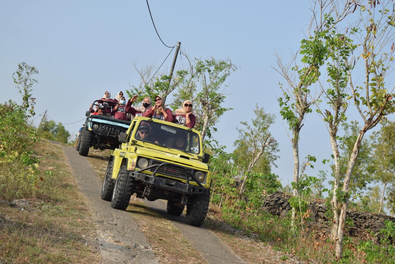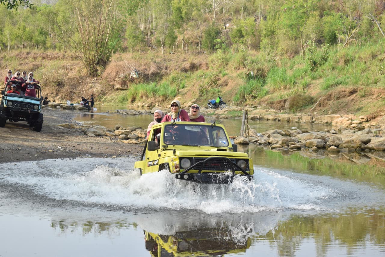 Wisata petualangan di atas jeep melalui rute jalan berbatu dan alam liar di sekitar Goa Pindul.