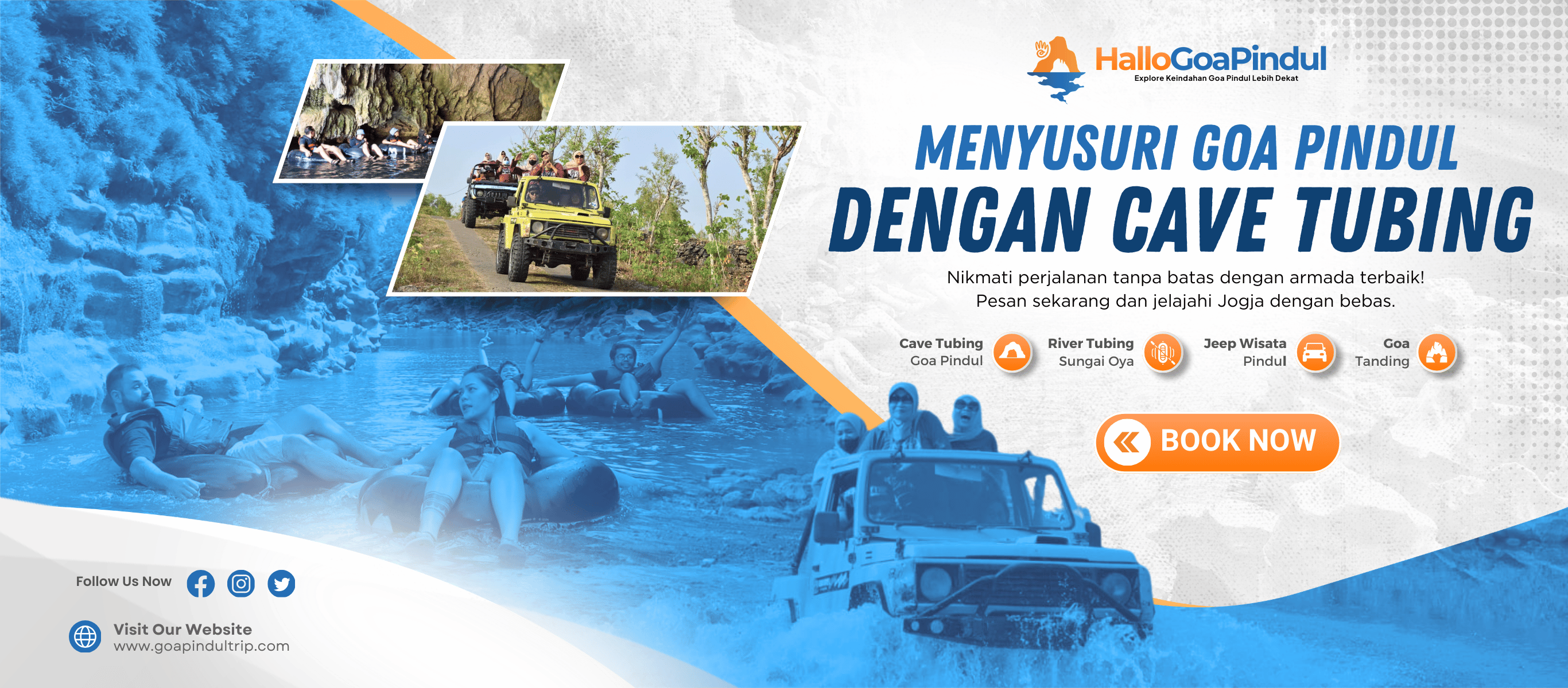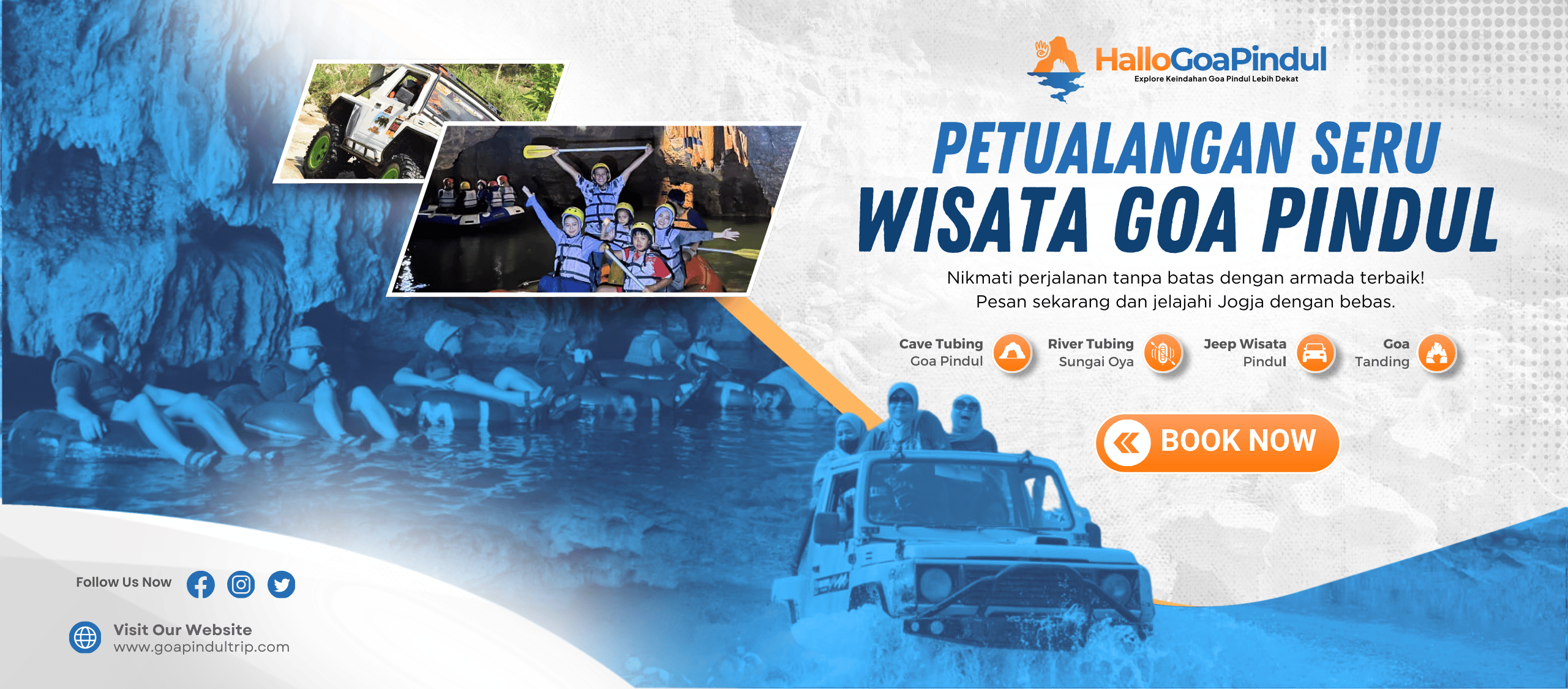 Hallo Goa Pindul penyedia layanan wisata petualangan alam di kawasan Goa Pindul, Gunungkidul – Yogyakarta. Kami menawarkan berbagai aktivitas seru seperti Cave Tubing Goa Pindul, River Tubing Sungai Oya, Jeep Wisata Pindul, dan Goa Tanding untuk memberikan pengalaman menjelajahi keindahan alam Gunungkidul secara menyenangkan.